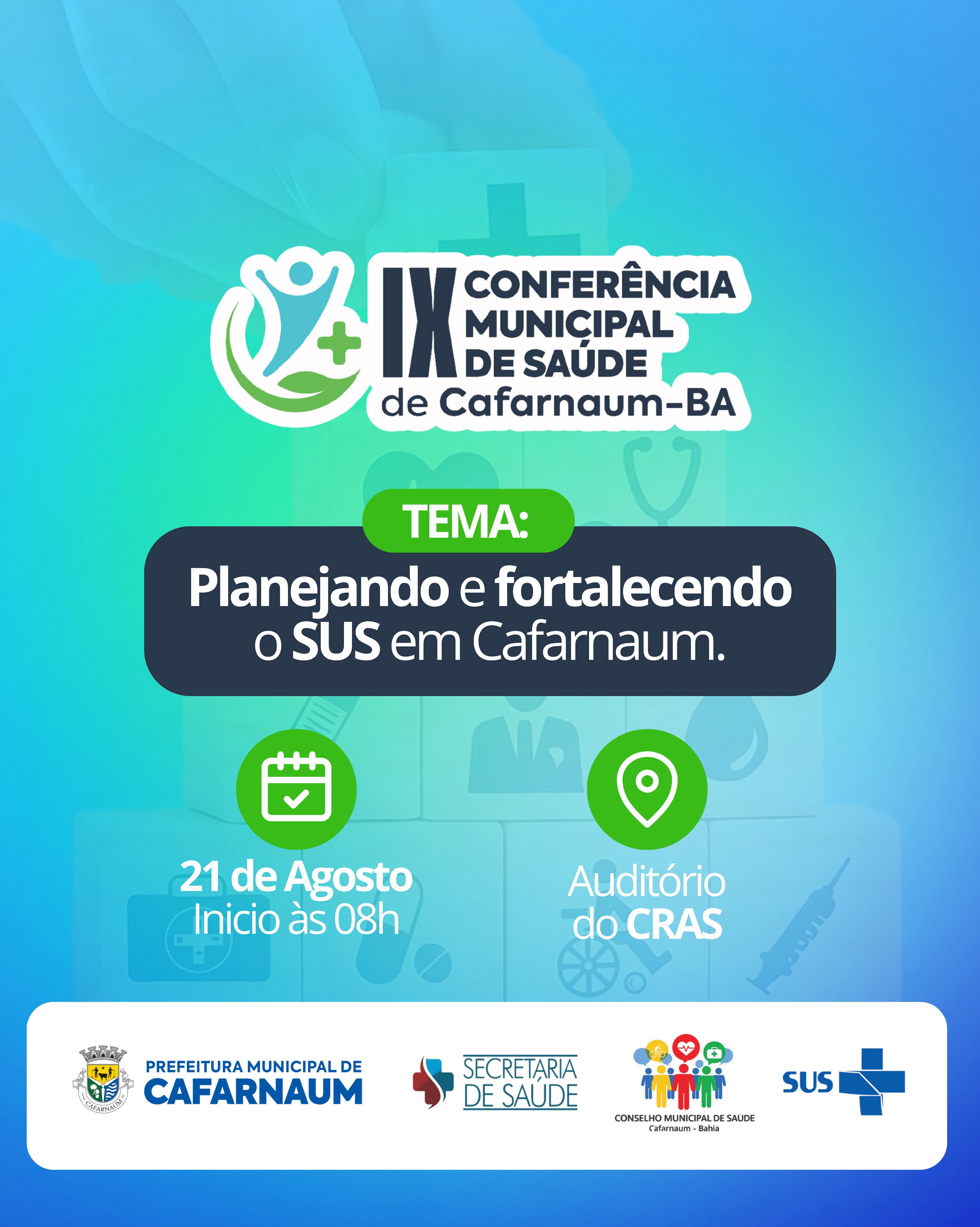 Destaque IX CONFERÊNCIA MUNICIPAL DE SAÚDE DE CAFARNAUM 08/08/2025 TEMA: Planejando e fortalecendo o SUS em Cafarnaum. Data: 21/08/2025 - inicio às 08h Local: Auditório do CRASCafarnaum - BA. Anexos WhatsApp Image 2025-08-08 at 09.17.29.jpeg1754656565.jpeg Mais Notícias